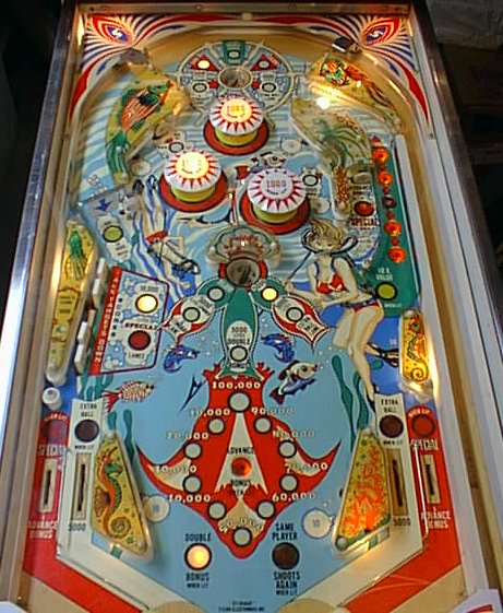We got this one as part of a package deal, not really expecting anything great. It was dirty and neglected, but cleaned up really well. Lots and lots of Novus and muscle (and nothing else to do during a Northeast winter). Turns out that the local YMCA has a swimming team, called the Saratoga Stingrays. Once it was cleaned up and running, the machine went to their gameroom, and all proceeds from the game are given back to the Stingrays team, to help defray costs for uniforms and sponsor memberships for disadvantaged kids. Anyway, you're here for the photos: